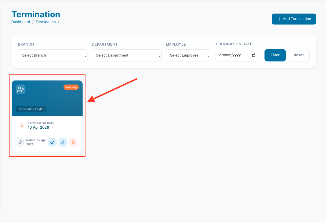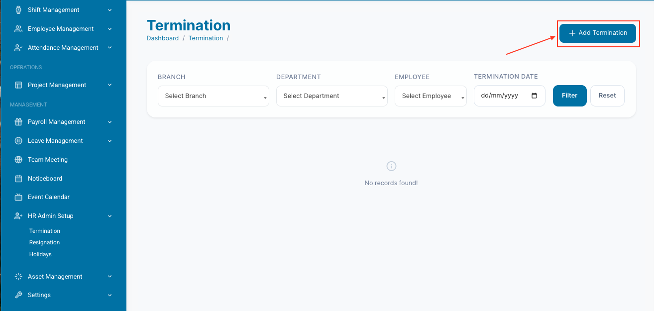 The Terminate Employee feature in Teamiy allows HR Admin to remove an employee from active employment records when they leave the organization. This helps maintain accurate employee data and ensures that terminated employees no longer appear in active lists, payroll, or attendance.