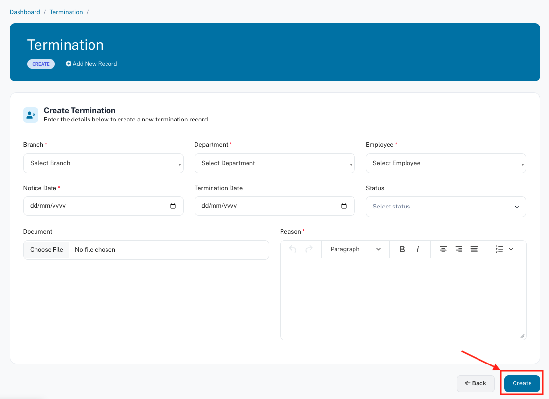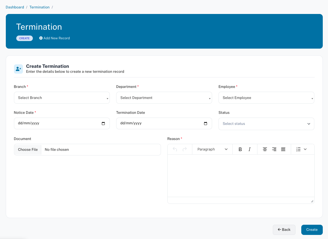 Enter the required information to terminate an employee. Each field helps record the employee’s termination properly and keeps HR records organized.