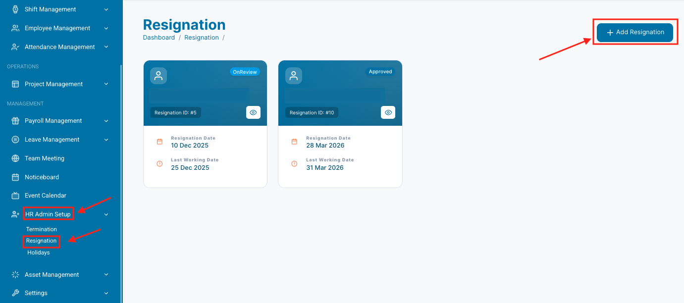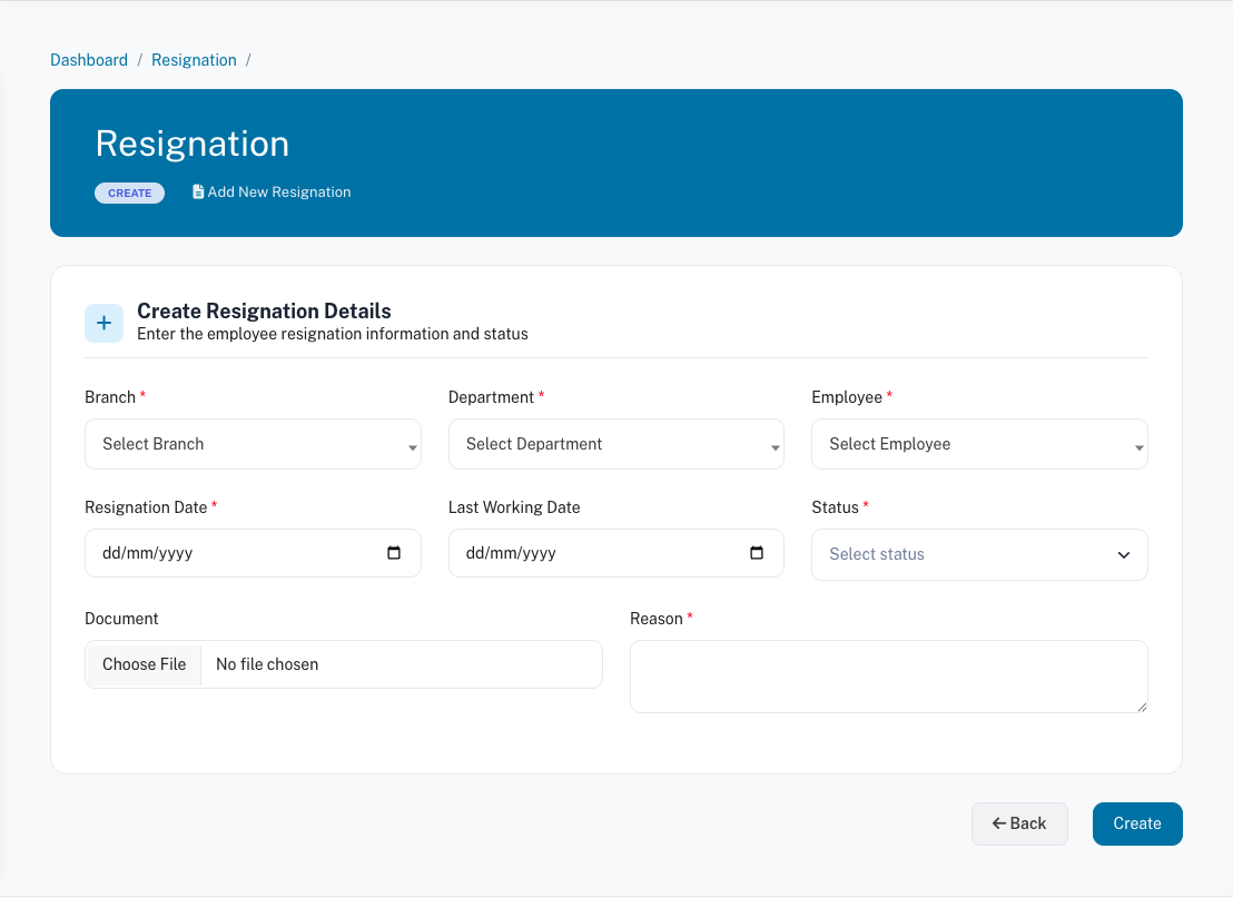 The Add Resignation feature in Teamiy allows employees or HR Admin to record resignation requests in the system. This ensures proper tracking of employee exits and helps HR manage approvals, notice periods, and transition processes efficiently.