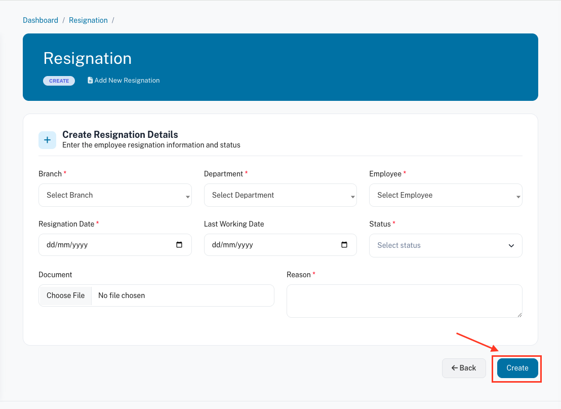 02. Department – Choose the department of the employee. This helps organize resignation records by department.
