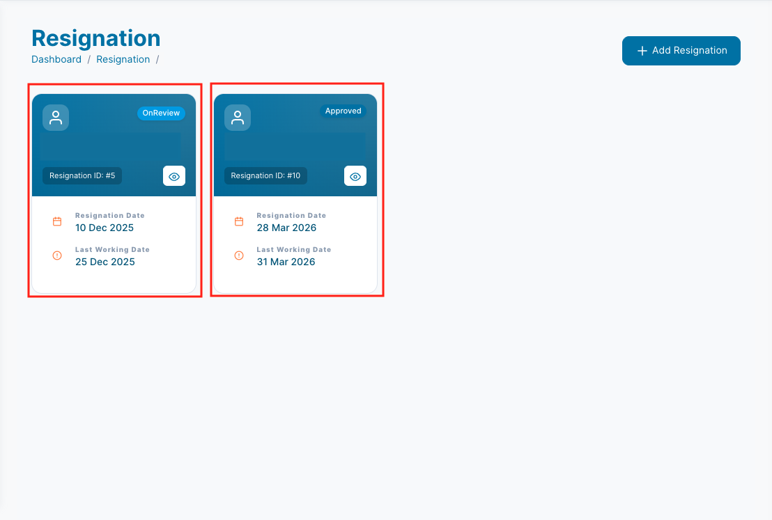 Once saved, the resignation will appear in the Resignation List. HR can track the status, approve or reject it, and manage the employee’s exit process efficiently.