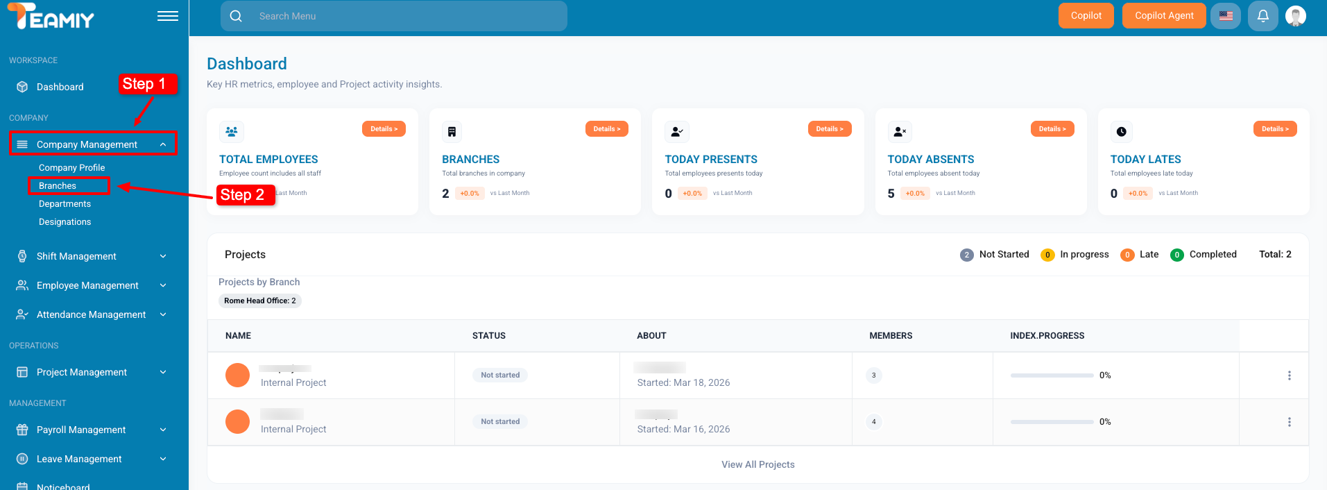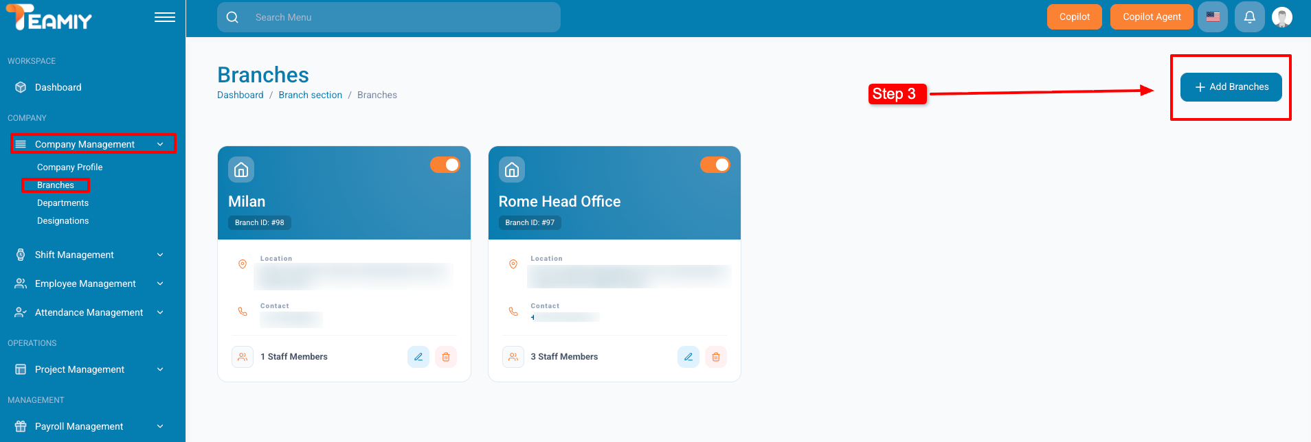 If your organization operates in multiple locations (for example, different offices, stores, warehouses, or project sites), you can create separate branches in Teamiy to manage them individually. This allows you to assign employees, manage shifts, and track attendance per location.