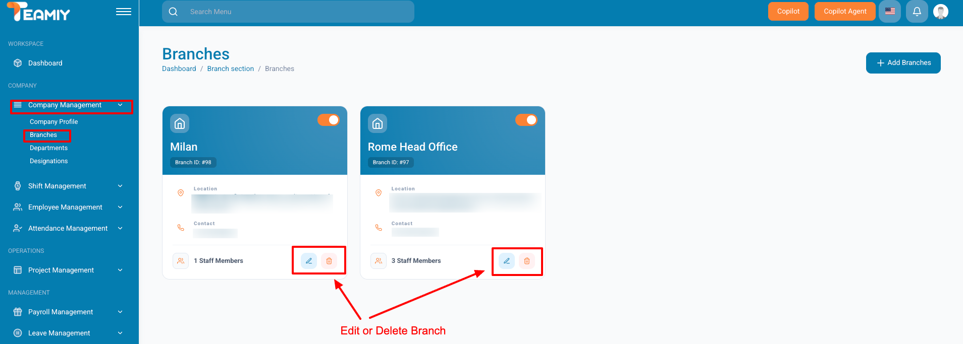 For managing your existing branches, go to your dashboard. Company Management -> Branches, and then edit, change status, or delete the branches you want.