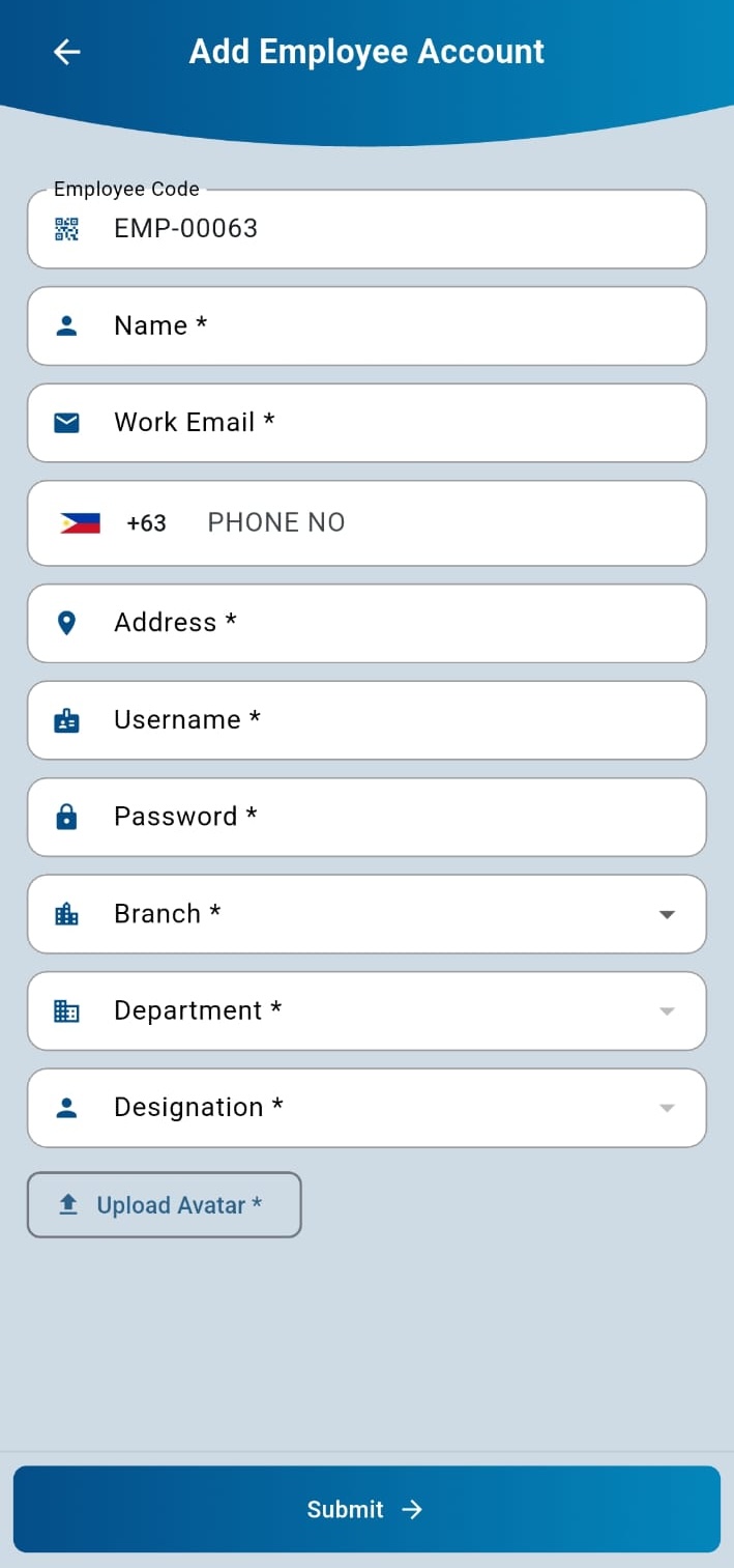 The Add New Employee feature in the Teamiy mobile app allows HR and administrators to quickly create employee profiles, assign departments, and manage employee information directly from their mobile devices.