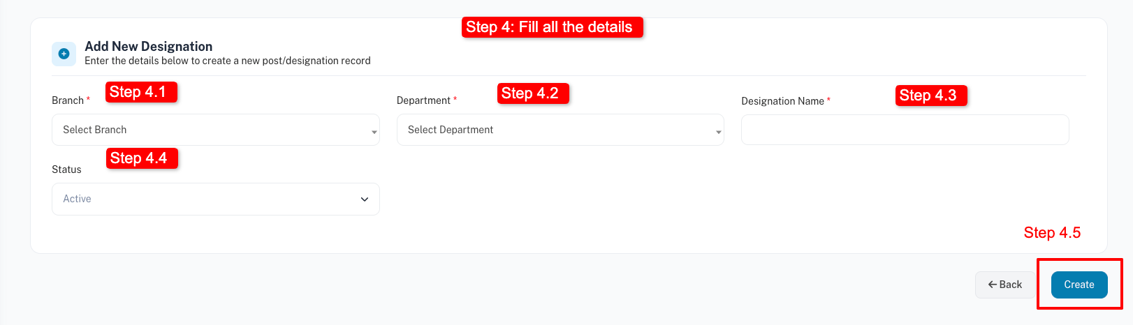 Fill out the form step by step, like first select the Branch, then select the Department, and then add the designation to avoid duplication and conflict.