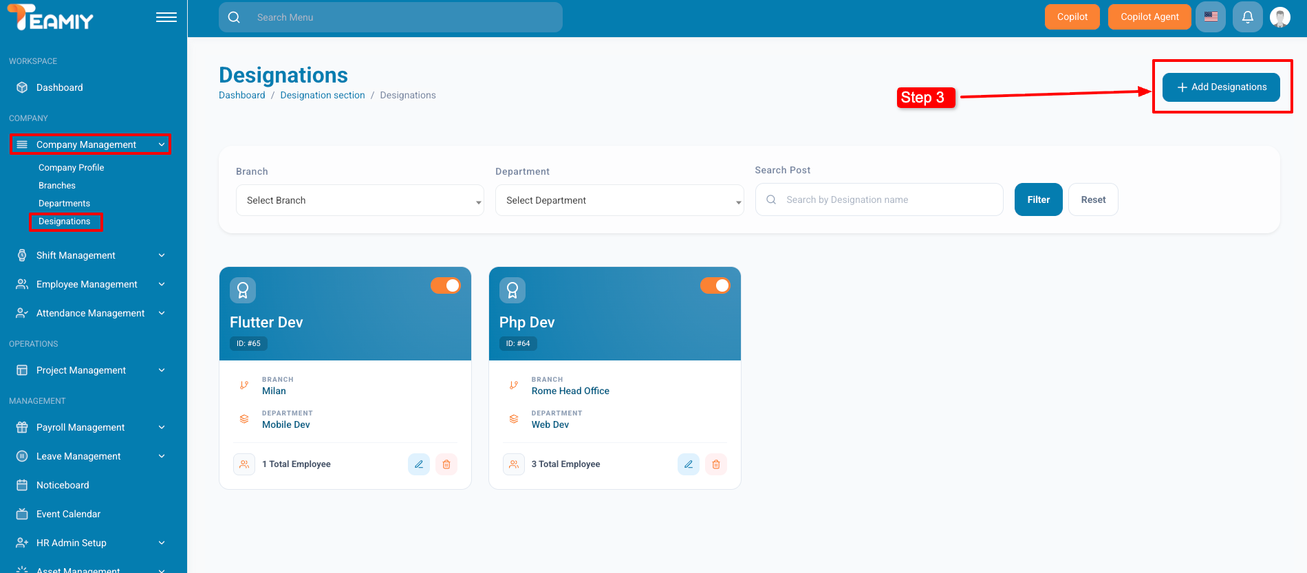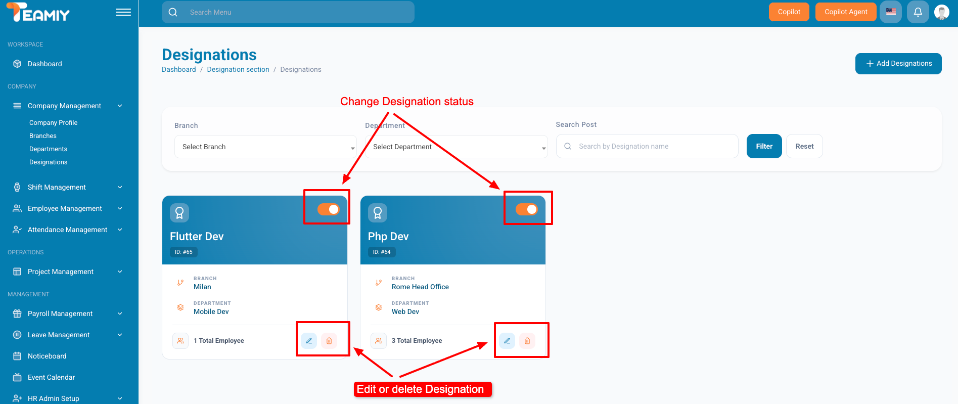 For editing, updating, changing the status, or deleting any designation. Go to Teamiy Dashboard -> Company Management -> Designations.